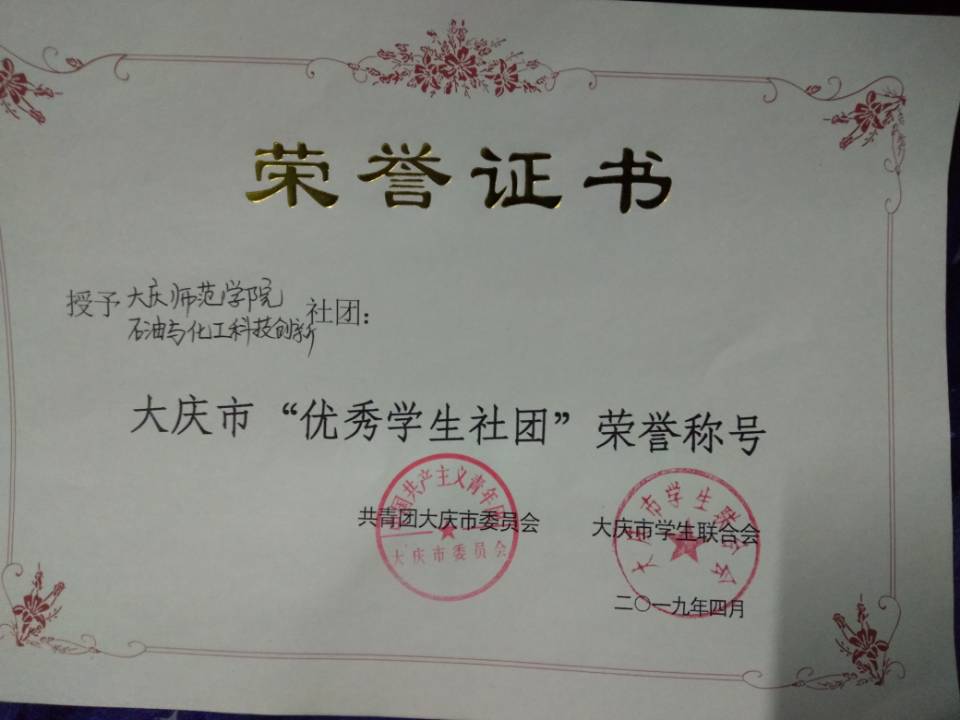 2019年5月16日下午,由大庆市学生联合会与共青团大庆市委员会举办的大庆市高校“优秀社团”评选活动落下帷幕,bwin必赢化学工程学院“石油与化工科技创新社团”荣获大庆市“优秀社团”称号。石油与化工科技创新社团的宗旨是“自强,创新,奉献”,该社团遵守学校与学院的相关规定,开展多次有益的社团活动,以大学生创新创业训练为基础,积极参与各类竞赛,培养优秀的化学科研工作者。