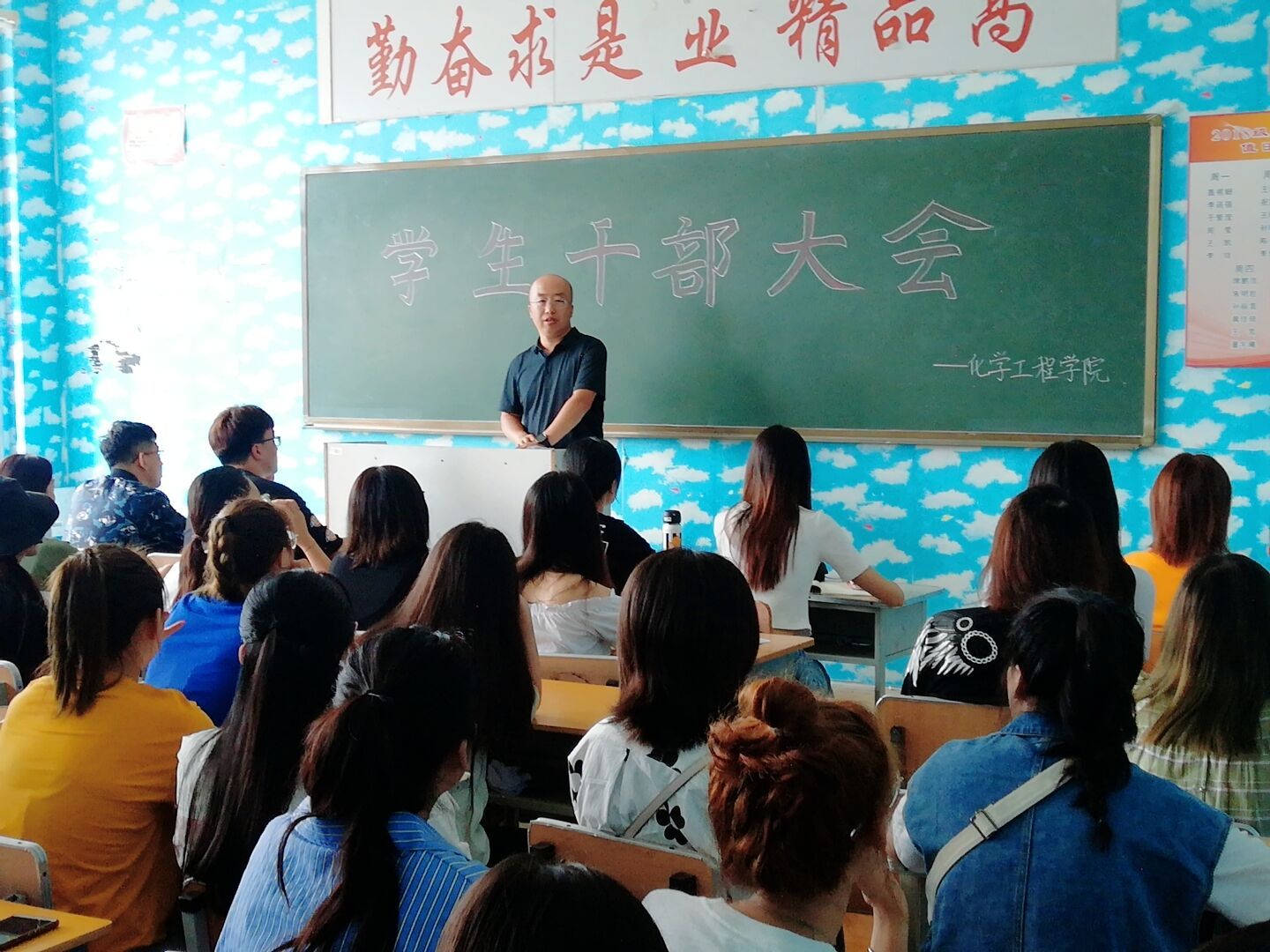 2019年9月7日化学工程学院在主楼205召开新学期学生干部大会,会议的主题围绕新学期的主要工作进行布置,学院学生党支部书记徐宏书对学生干部强调要重点做好以下几点工作:1.认真统计学生返校情况,确保安全到校;2.关注学生心理健康,有事及时上报;3.做好迎接新生准备工作,不做新生买卖,不做违反学校规定的事情;4.要好好学习,按时出勤;5.开学前两周进行补缓考,认真复习考试,同时做好学业预警工作。