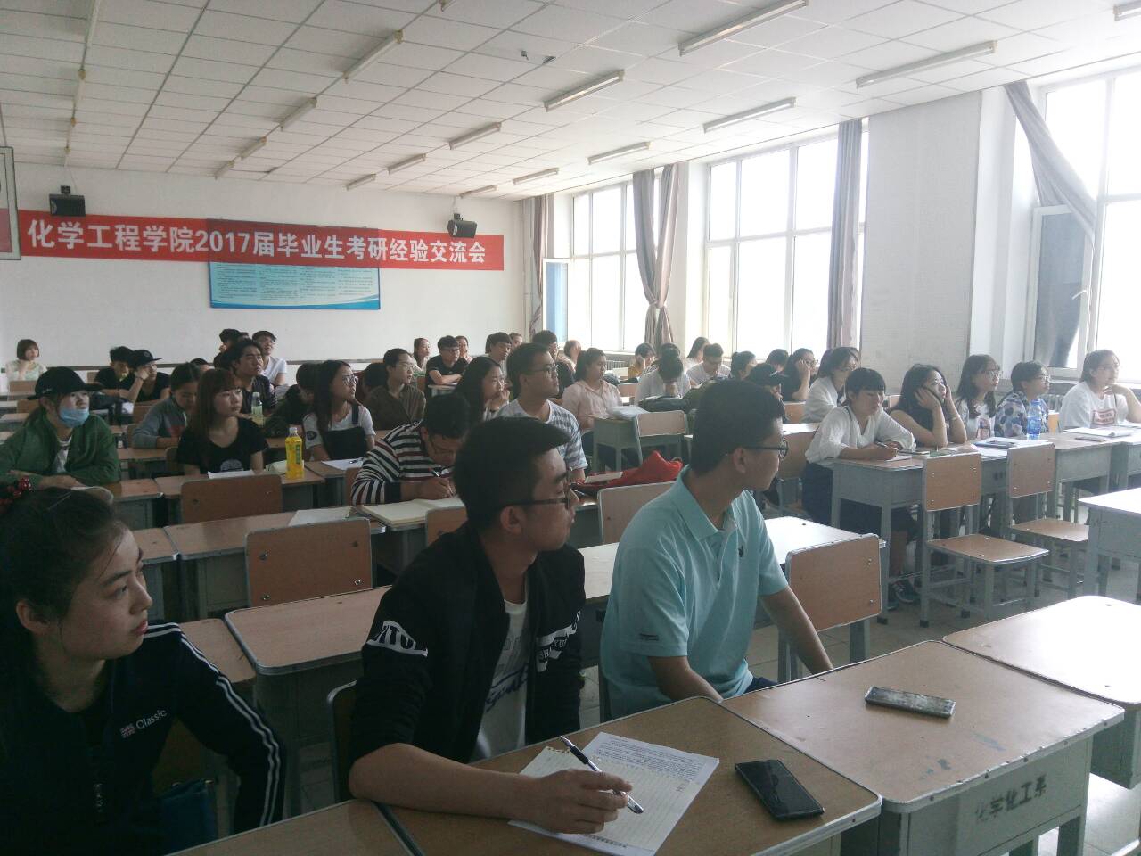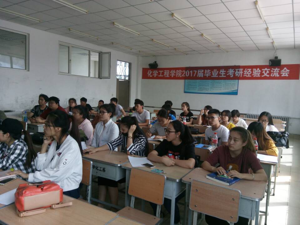 2017年5月17日下午1点30分,化学工程学院在主楼211教室举办了2017年考研经验交流会。本次活动由化学工程学院学生党支部书记徐宏书主持。2013级4名优秀的考研学子以及2014级70余名备考同学参加了本次交流会。