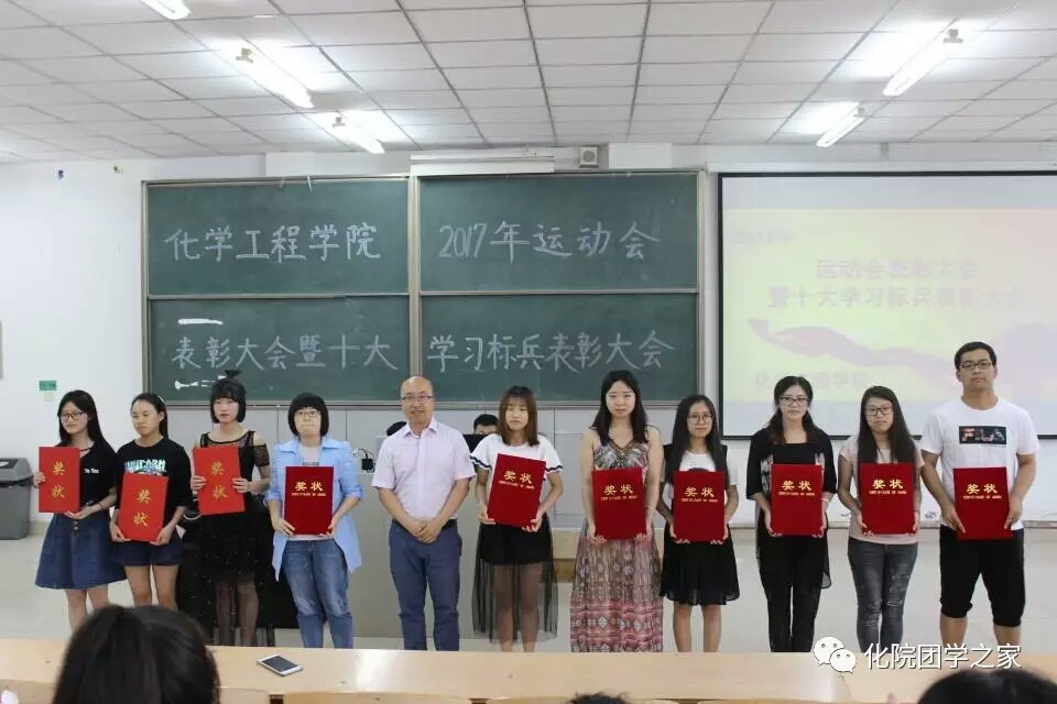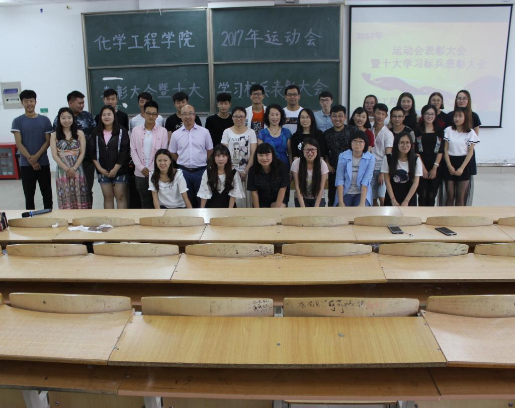2017年6月14日下午,化学工程学院在主楼2-4召开了第三十六届田径运动会运动员表彰大会暨十大学习标兵表彰大会,出席本次活动的有学院党总支书记孙冬艳、学生党支部书记徐宏书、团总支书记郭明悦、2016级学生辅导员韩冬以及本届获奖运动员、十大学习标兵及优秀青年志愿者。