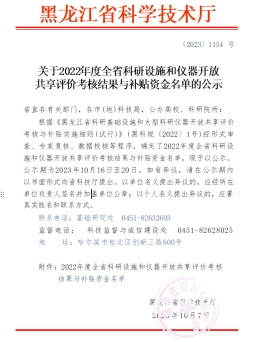 2023年10月16日黑龙江省科学技术厅下发《关于2022年度全省科研设施和仪器开放 共享评价考核结果与补贴资金名单的公示》,bwin必赢经形式审查、专家复核、数据校核等程序评定后,考核等级为“良好”。