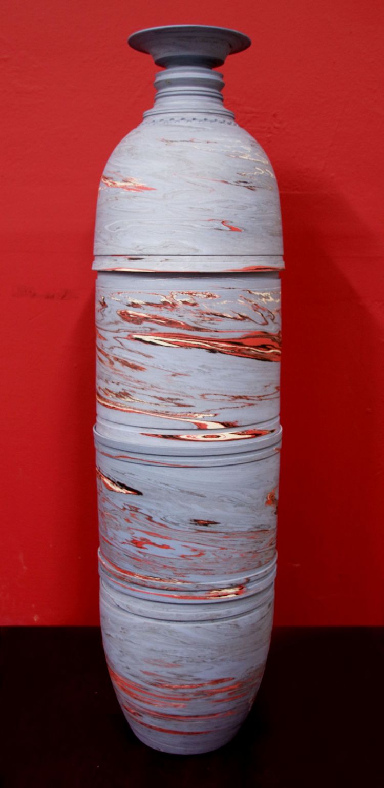 在学校宣传统战部、科研处等部门的关心协调下,美术与设计学院组织大庆油陶团队召开动员会,并多次在陶艺与装饰设计实训室现场分析研讨。大庆油陶团队在李方海教授带领下,聘请山东、辽宁、大庆等地的几位陶艺大师和雕刻家参加设计制作和雕刻,共同研发一批“油陶杂彩”作品。油陶杂彩的制作研究不仅是丰富单色油陶艺术的需要,也是通过进一步探讨油陶杂彩烧成技术,融合色彩、纹样、图形联想等拓展审美意蕴,丰富陶艺的品类,在陶艺历史上又一新的突破。作品中利用历史名人、英雄形象、时代楷模,双观图形式(图底反转)巧妙融入到《铁人瓶》系列中,诠释大庆精神和铁人精神。